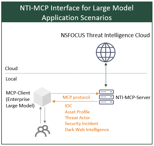 For enterprises that have deployed large language model security analysis systems, NSFOCUS provides a standardized interface for threat intelligence (MCP) to achieve deep integration with AI models. NTI-MCP supports all-round threat intelligence data capabilities, covering various threat intelligence data types such as IOC (IP, domain name, file hash, URL), asset profiling, attack organizations, security incidents, and dark web intelligence.