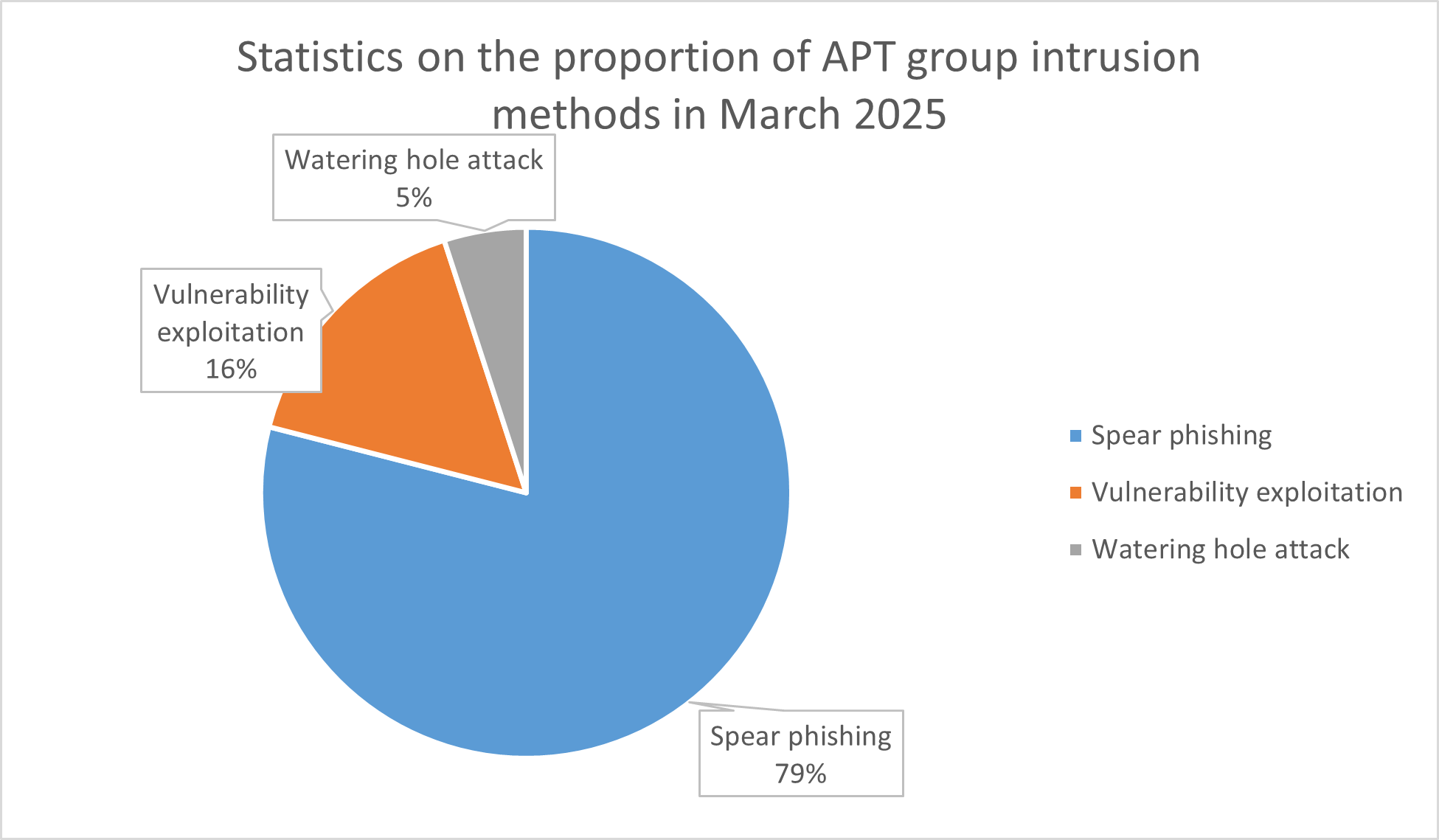 The most popular intrusion method for this month’s events was spear phishing email attack, which account for 79% of the total attack incidents. There were also a few attack groups that used vulnerability, and watering hole attack for intrusion.
