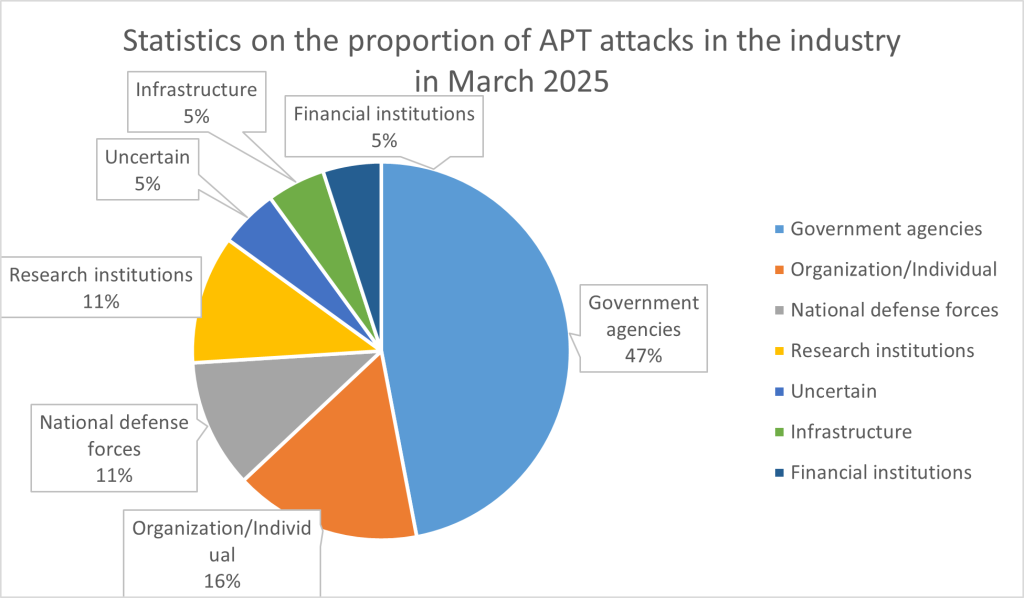 In March 2025, the primary targets of APT groups were government agencies, accounting for 47%, followed by organizations and individuals which account for 16%. Other attack targets include national defense forces, scientific research institutions, infrastructure, etc.