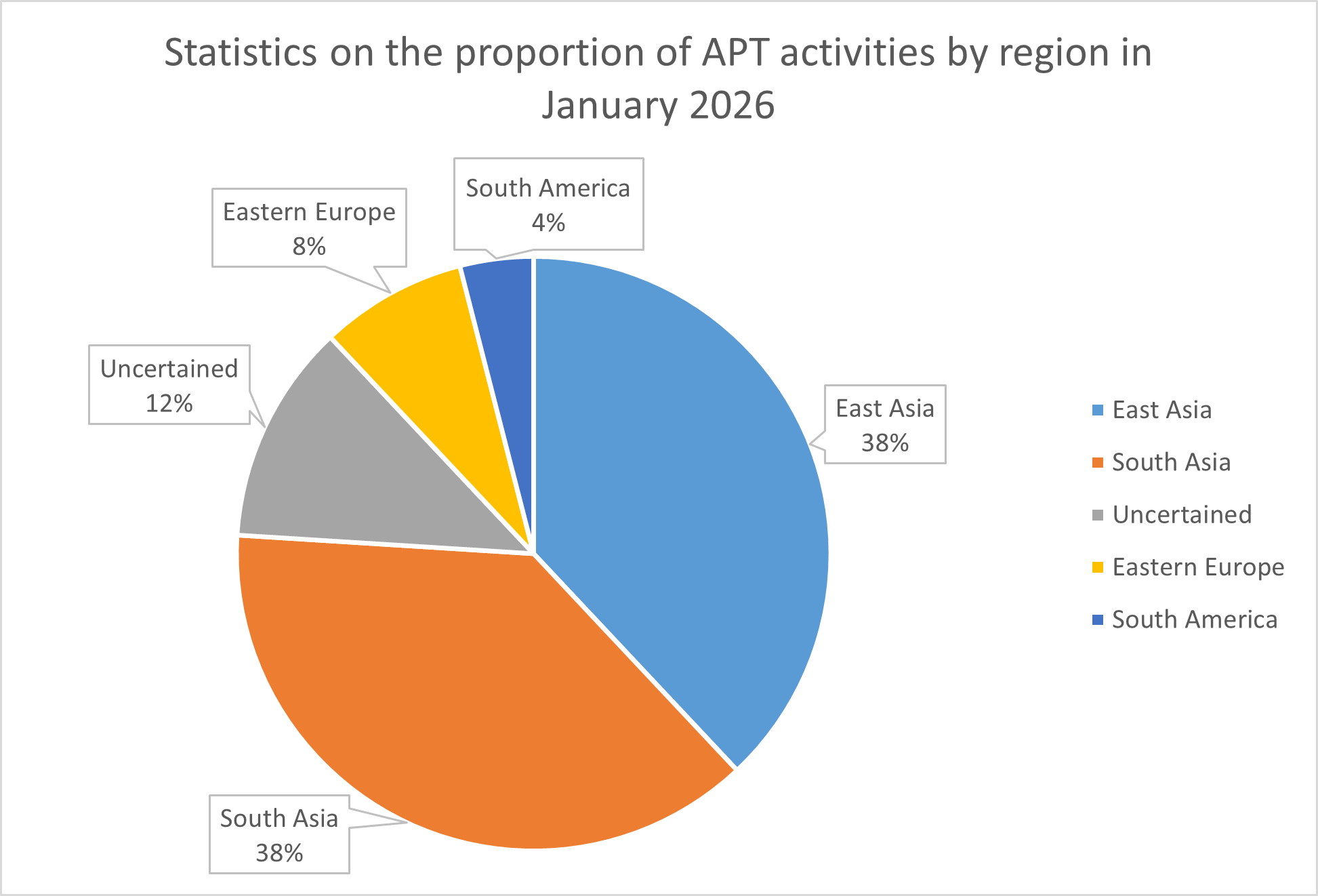 In January 2026, the global threat hunting system of Fuying Lab detected a total of 26 APT attack activities. These activities were primarily concentrated in regions including East Asia, South Asia, and Eastern Europe, as shown in the figure below.