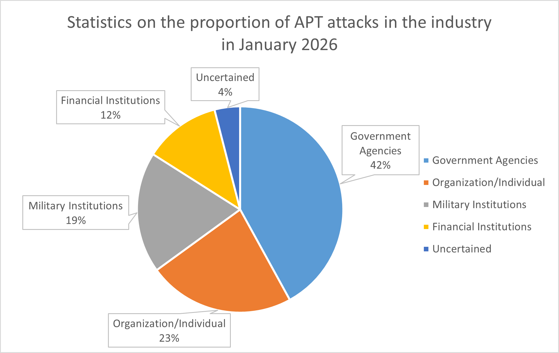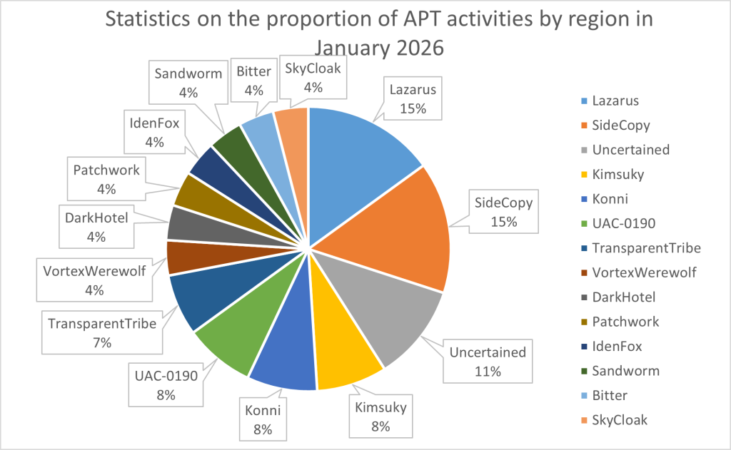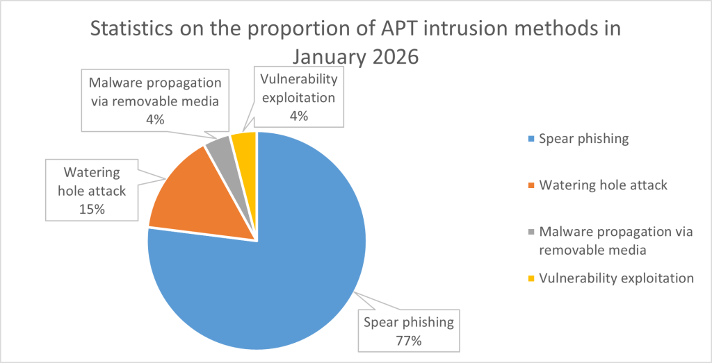 In January 2026, the primary target industries for APT groups were government agencies, accounting for 42%, followed by organizations or individuals accounting for 23%. Other attack targets included military institutions and financial institutions.