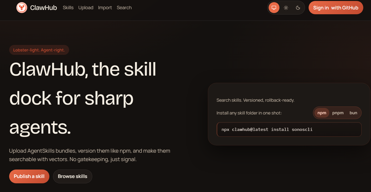 ClawHub is the official Skills plug-in distribution platform officially launched by OpenClaw, which hosts more than 3k open source Skills; it supports one-click plug-in installation and deployment through OpenClaw’s CLI client. And the threshold for uploading custom skills is extremely low, you only need to register a Github account that does not require real names.