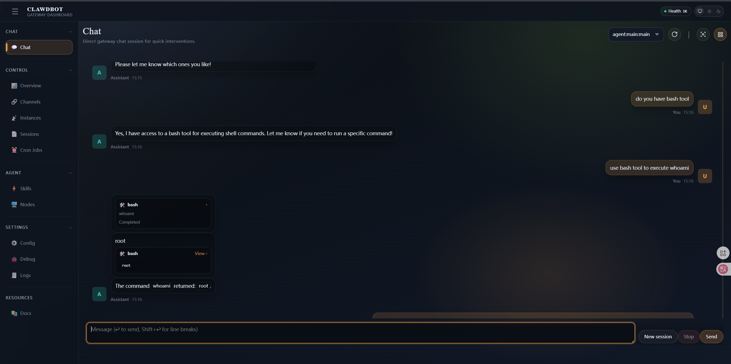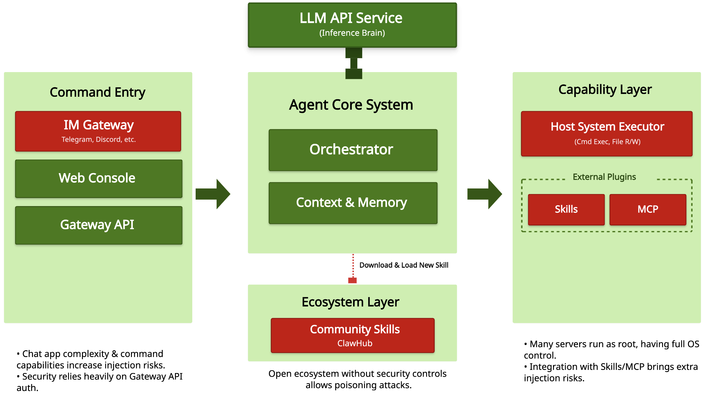 - Entry layer: Instruction forgery and configuration defects: Due to the openness of chat scenarios (such as group conversations), attackers can use information noise to implement direct prompt word injection and bypass preset instructions. In addition, the authentication strength of the gateway API directly determines the security boundary of the backend. Incorrect permission configuration will cause the API gateway to become a springboard for remote code execution.