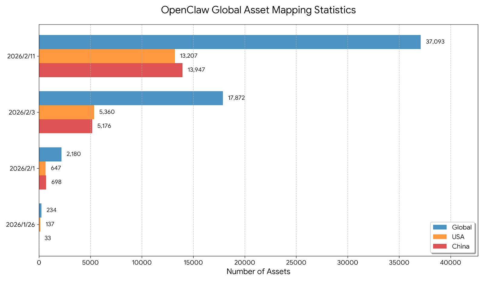 The mapping data of the entire network shows that OpenClaw’s assets in the wild have grown rapidly in the short term, and China has surpassed the United States to become the world’s largest deployment area. At the beginning of 2026, there were only a few examples in the world, and then it quickly entered the scale of 10,000. By mid-February, it had accumulated to tens of thousands. In terms of regional distribution, China’s asset volume has gradually caught up with and surpassed the United States. As of press time, it has surpassed the United States by about 14,000, ranking first in the world.