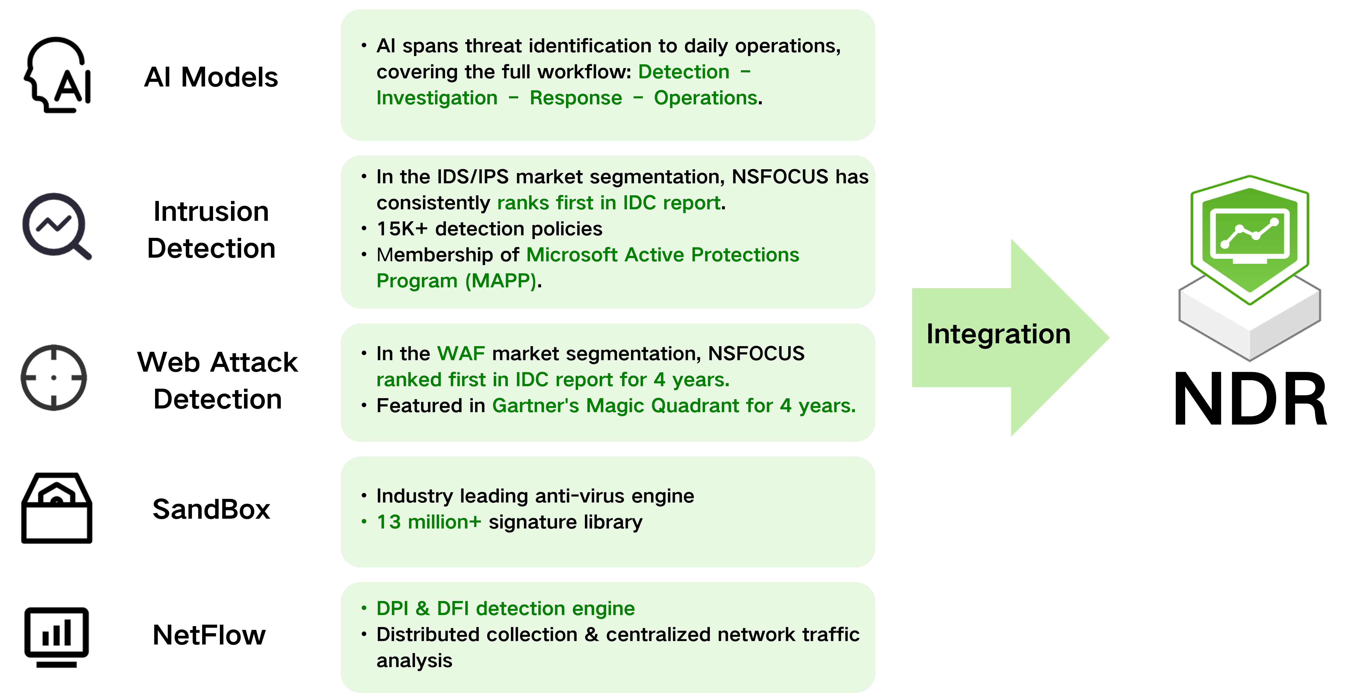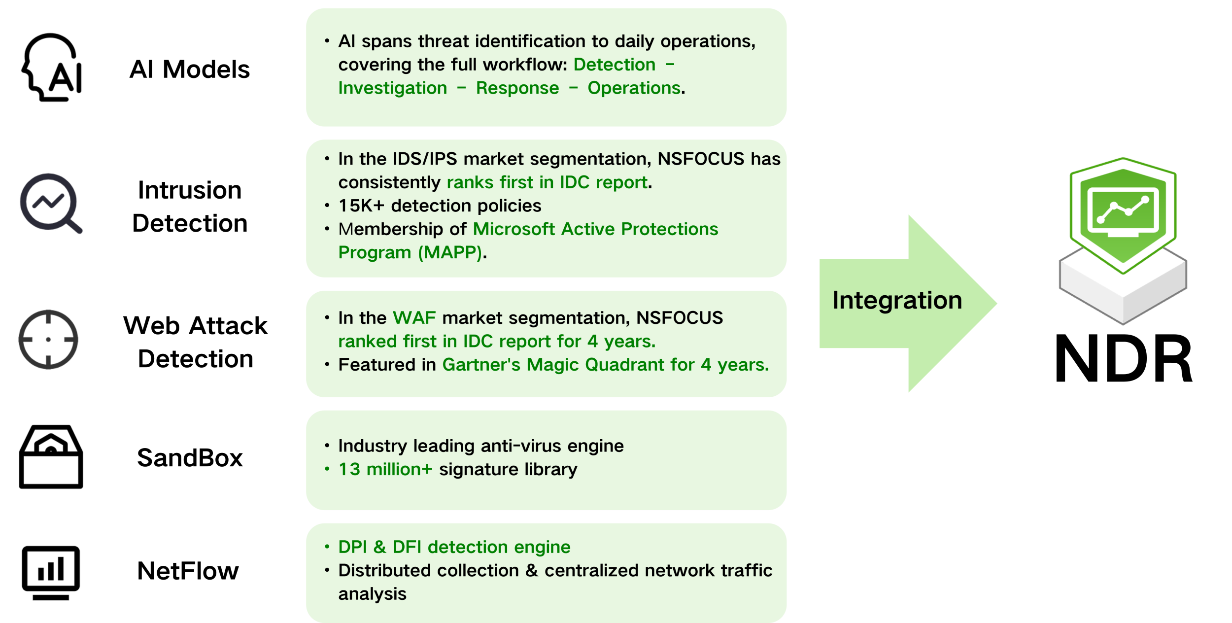 NSFOCUS NDR integrates AI, threat detection, and other capabilities to create a unified “detection-analysis-response” closed loop, saving the trouble of multiple product composition.