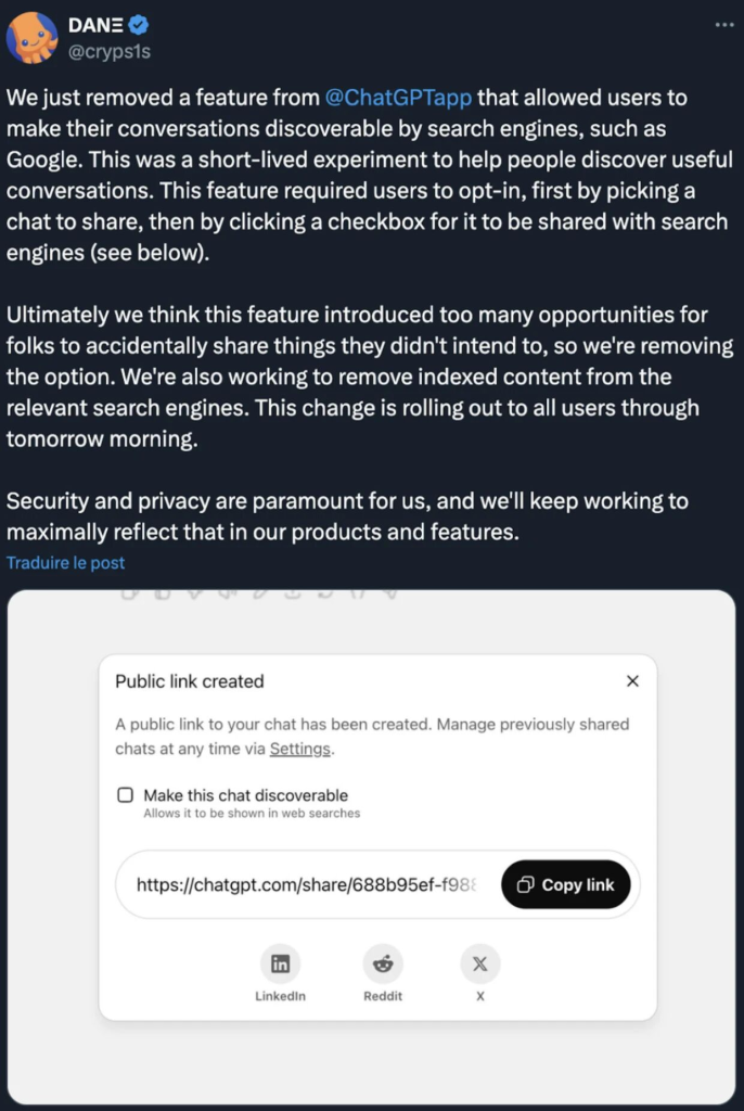 In July 2025, OpenAI launched the “Share Link” feature in its ChatGPT with an option to “make this chat discoverable”, which was a short-lived experimental feature. This feature is designed to make it easier for users to share conversations with others