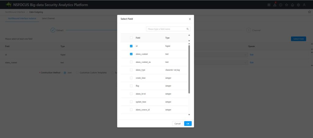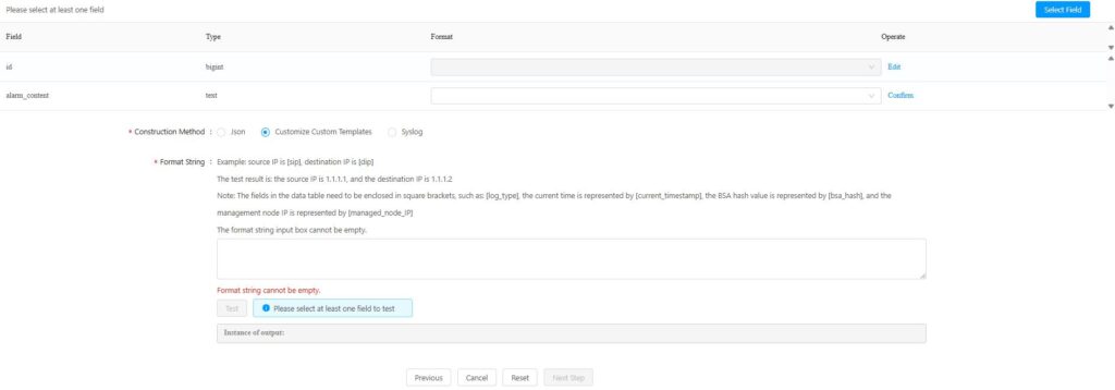 3.Select the construction method: Choose a construction method for the entire data set sent to the selected library table. The available construction methods are: JSON, custom template, and syslog.