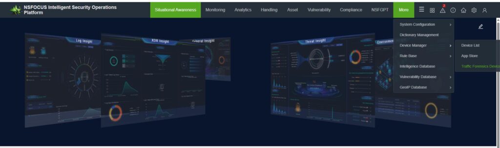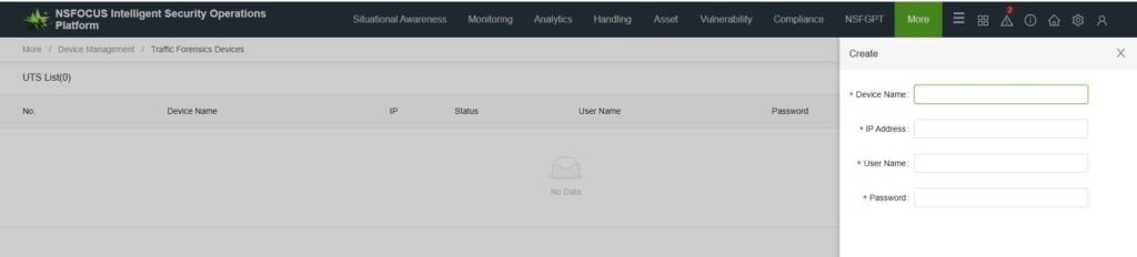 At ISOP [More—Device Management—Traffic Forensics Device], in the configuration, add a traffic forensics device.