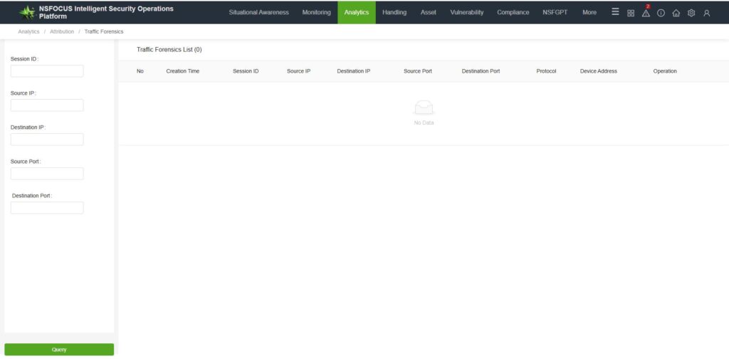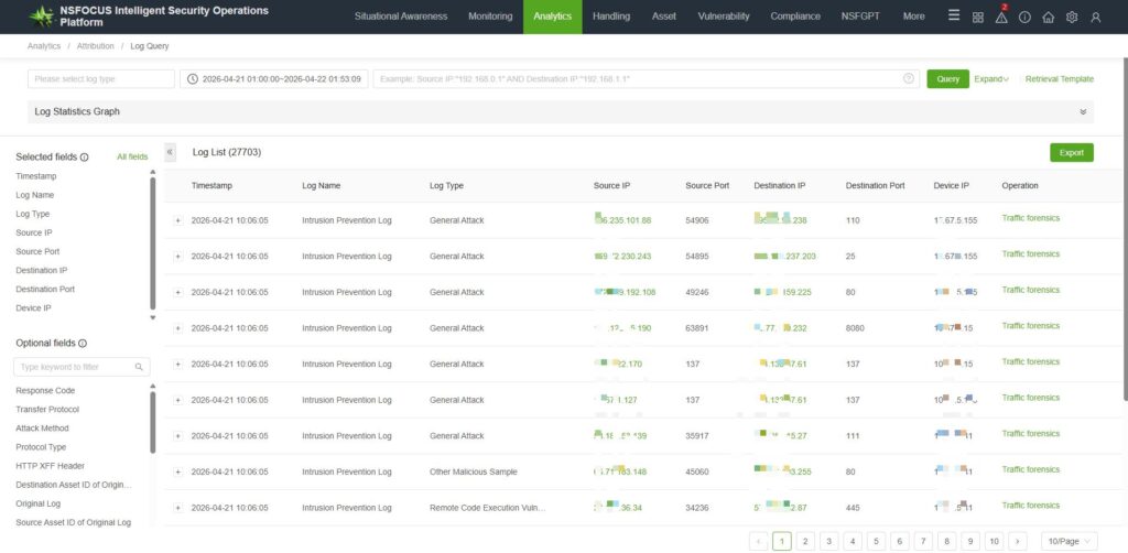Traffic forensics can be initiated based on session data or malicious traffic logs on the platform.Go to [Analytics—Attribution—Log Query]. For intelligent log retrieval, click [Traffic Forensics].