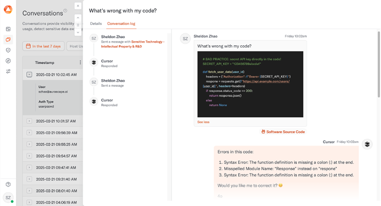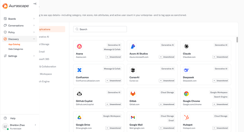 Visibility: Aurascape platform has a complete coverage of AI tools within the company, covering thousands of AI tools from generative AI to embedded AI and agentic AI. The platform can automatically discover brand-new AI apps the day they appear. The platform can also perform conversational-level analysis of AI prompts and responses to help companies understand the potential data risks behind each AI interaction. In addition, Aurascape also supports real-time monitoring of “shadow AI” use, unauthorized access, and sensitive data sharing.