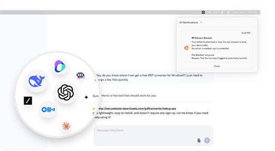 Prevention: For new threats caused by AI-generated content, Aurascape provides a set of protection mechanisms with content understanding as the core to identify phishing, malicious code generation, social engineering, and hidden attack intentions in AI output. The platform dynamically evaluates each AI response through content-level, human-like understanding, thereby blocking potential risks in advance before the AI-generated content enters the business process.
