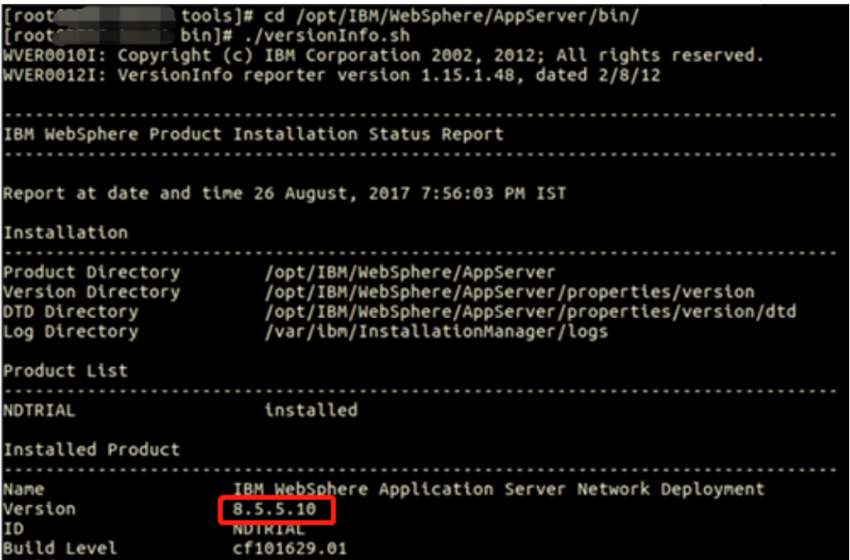 Method 2: Enter the /opt/IBM/WebSphere/AppServer/bin directory and execute ./versionInfo.sh to view the current version. If the current version is within the affected range, there may be a security risk.